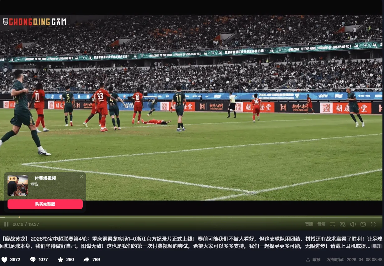 虎扑04月09日讯 中超第4轮,重庆铜梁龙客胜浙江队,赛后俱乐部官方制作比赛纪录片,该纪录片在各视频网站均为付费观看。